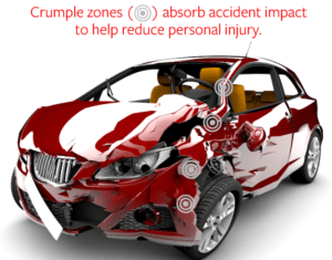 A crumple zone is a part of a vehicle that is designed to ‘crumple‘ in a vehicle crash and absorb the main force of impact. This design is to reduce the impact of a vehicle accident. From a physics aspect there are 3 laws of Newton in a car crash. These 3 Laws of motion, law one is called the law of inertia, law two is called the law of acceleration and the third law is called the law of action and reaction.
